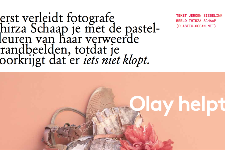 ‘Met haar bij elkaar gejutte installaties van zongebleekte tasjes, rietjes en teenslippers vraagt fotografe Thirza Schaap aandacht voor het feit dat er binnenkort meer plastic in zee rondzwemt dan vis. Maar in haar werk duikt soms ook een verpakking van een miljardenmerk op…’ Adformatie, april 2018.