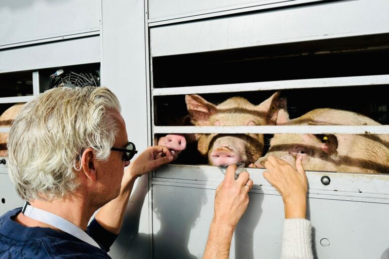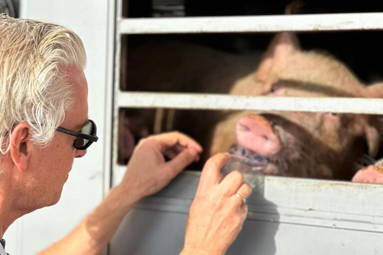 Tegenop gezien, toch gegaan, nog stil van. Een wake van de Save Movement bij dieren in de wachtrij voor de slacht. Water en wat liefde geven aan enkele van de dagelijks 45.000 varkens die in Nederland worden gedood.
